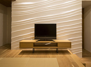どの場所に置いても宙に浮いているかのごとく存在するTVボード。本体の厚みを薄くして軽快さを出し、浮遊感を出す為に脚の部材を極力細くしている。