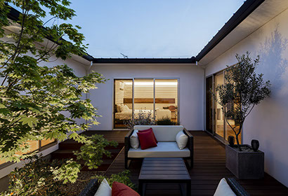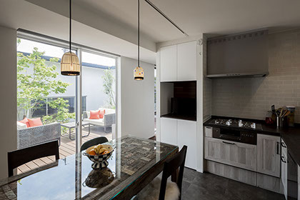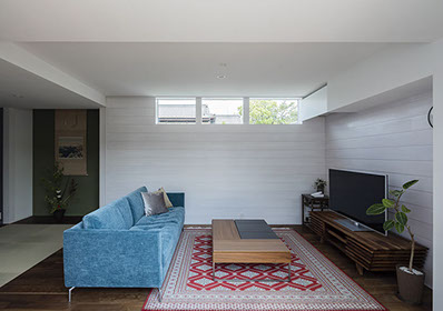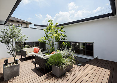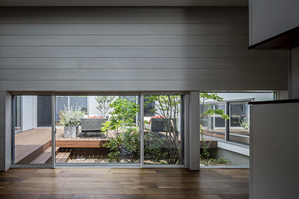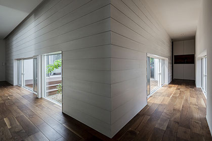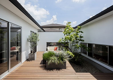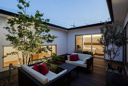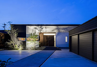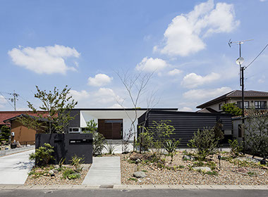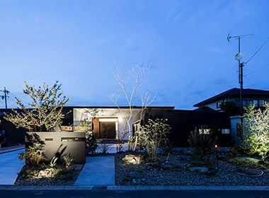 建築主は各部屋から緑が眺められ、安らぎと豊かさを感じながら過ごせるリゾート感のある平屋建ての住宅を望んでいた。コントラストが効いた印象的な外観と夜間でも植栽の影が外壁に映るように計画した植栽計画など、昼夜問わず印象的な住宅となっている。外部に面する部分は閉鎖的にしてプライバシーを確保しているが、ロの字型の中庭形式で計画することで、内部は外部との隔たりを感じさせない明るく開放感な空間になっている。中庭を囲んだ各部屋はどの場所からでも中庭へ行き来ができ、そして、どの場所からでも緑が眺められように視覚的にも繋げているため各所に広がりを感じさせている。