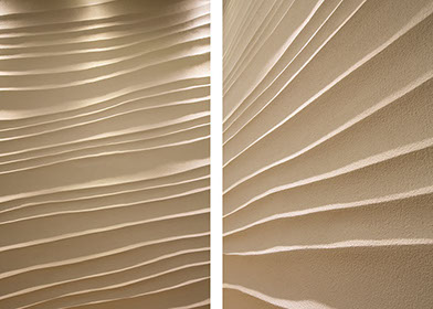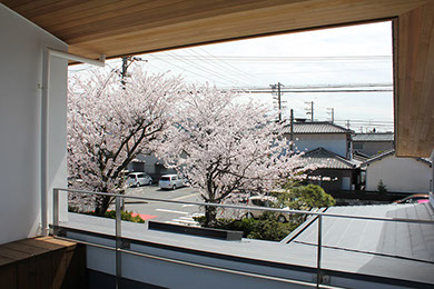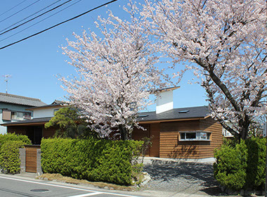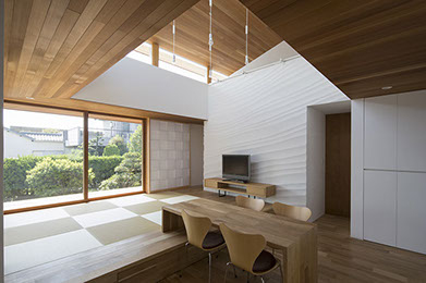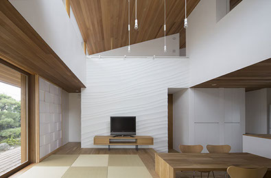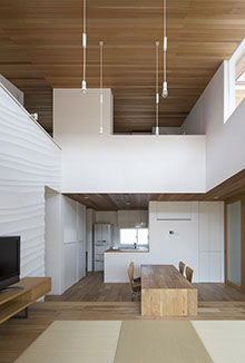 建築主は温もりとやすらぎを感じながら生活できる住宅を望んでいた。2階建てだが、建物の高さを抑え、南側から見る外観は平屋建てのように見せている。内部は回遊性と開放感を意識して計画している。家事・生活導線だけでなく、外部テラスを含めて建物内外を回遊できることで、各スペースを最短距離で移動できる平面計画となっている。またリビングに吹抜けを設けることで開放感を与え、2Fの居室と吹抜けを繋ぐことで内部空間に一体感を与えている。内外の仕上材は左官材や木板を使用することで素材感による温もりを与えている。リビングの一部壁は、左官職人の久住有生氏による施工。波のうねりをイメージしたこの左官壁は、柔らかなうねりの模様が日常生活にやすらぎを感じさせる。