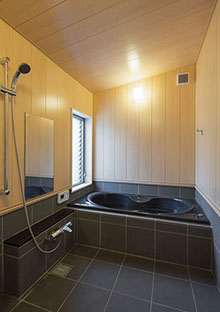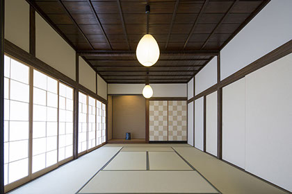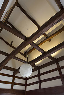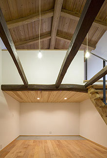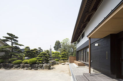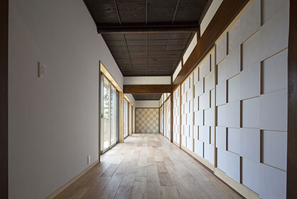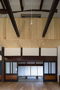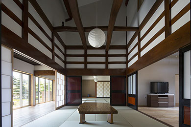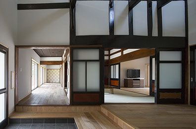 富山県での古民家再生の物件。建築主は以前から「古民家に住みたい」という思いがあった。今回、縁あって築65年程経つこの民家を購入することとなり、それを機に全面リフォームを行うこととなった。外装は劣化が激しかった為、一部のアルミサッシ以外、屋根瓦、外壁を含め、全てを取替えている。内部は既存の柱や梁を意匠的に生かしつつ、元々の居室広さを有効的に使用出来るような平面計画とし、自然光をLDKにも多く取入れるように一部減築して中庭テラスを計画した。内外共に古民家の印象は残しつつも現代風の要素を取入れている。