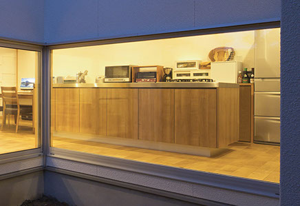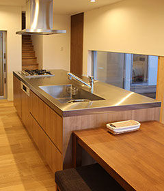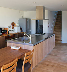 収納力がある木の収納箱をイメージしたオーダーキッチン。離れた場所から見るこのキッチンは、シンプルで温もりのある大きな「木箱」に感じる。アイランドキッチンにして回遊性を確保し、前面は全て収納としている。