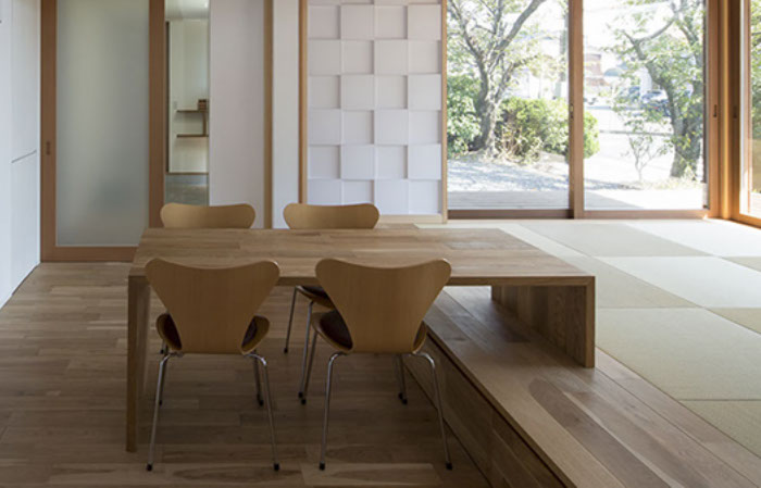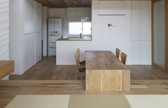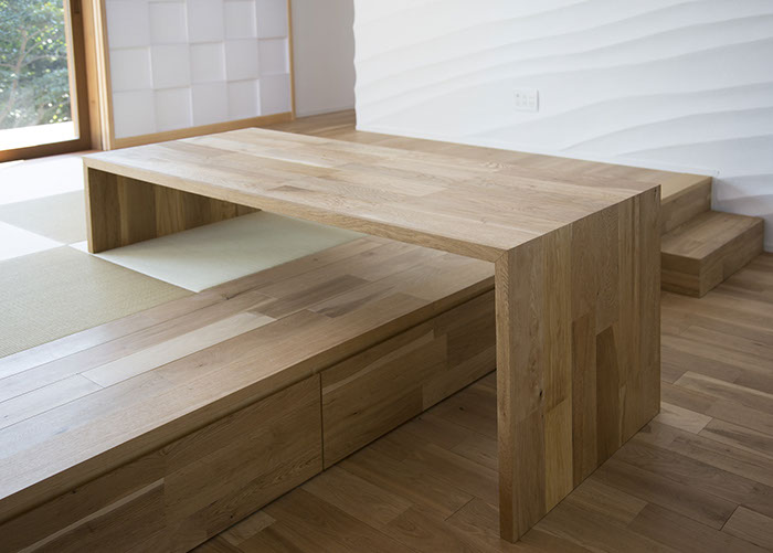 段差のある床で使用するダイニングテーブル。一枚板を折り曲げたような形状のこのテーブルは、左右で脚の高さを変えている為、本体を移動することで畳での使用や椅子での使用に対応する。仕上げ材に床フローリングと同材を使用することで空間に統一感を与える。