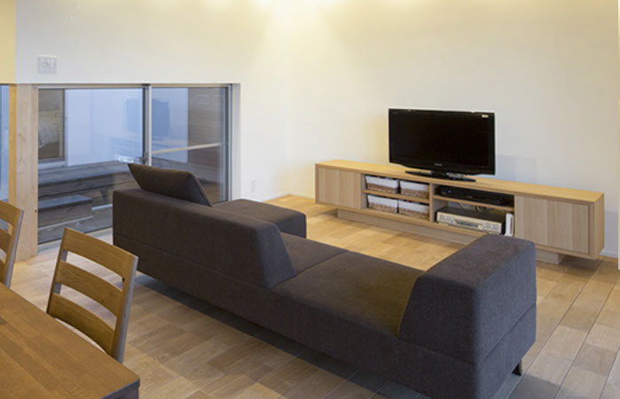 見せたい物は見せ、隠したい物は隠すためのTVボード。木の素材感が温かみを与え、素朴なデザインが室内空間に違和感なく溶け込む。