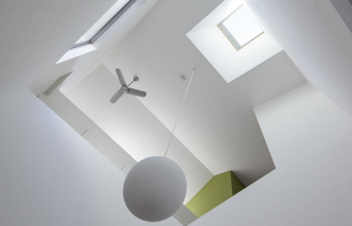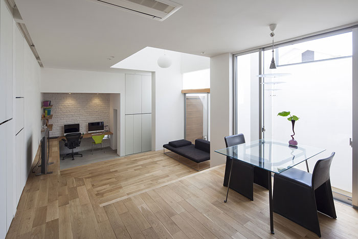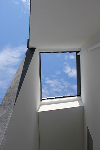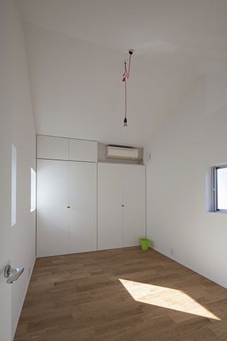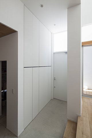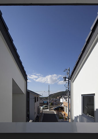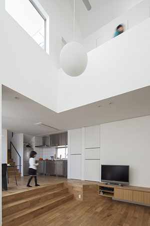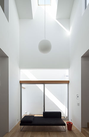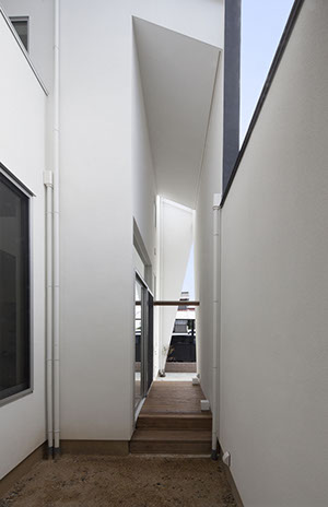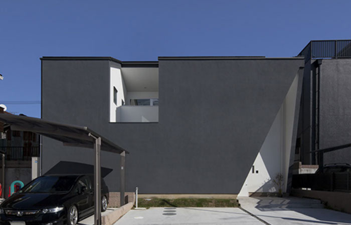 犬山城へと続く本町通りから少し外れた敷地に建つこの住宅は、どことなく城下町にある「蔵」の雰囲気を感じさせる。四角い箱から三角状に切り落とした部分を玄関ポーチと兼ねることでシンプルで印象的な外観とした。内部は1Fを共用スペース、2Fをプライベートスペースとした。西側以外は建物に囲まれており、室内に自然光が入りずらいが、中庭(光庭)を設け、そこから入る自然光と壁面反射光により、外観とは対照的な明るく解放的な室内になった。また各スペースを階段で徐々に上がっていく「登り窯」のような空間構成とし、横に伸びる空間(LDK)と縦に伸びる空間(吹抜け・テラス・中庭)を繋ぐことで空間に広がりを持たせ、段差によって変化する天井高が空間全体にメリハリを付けている。