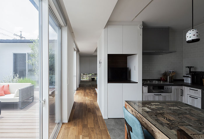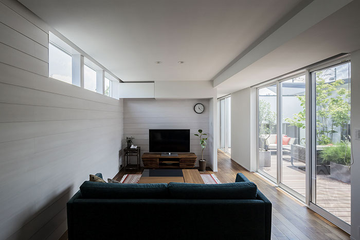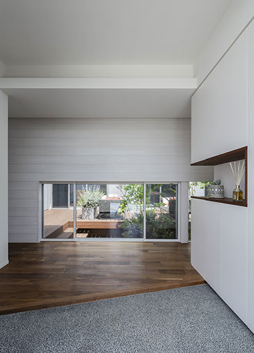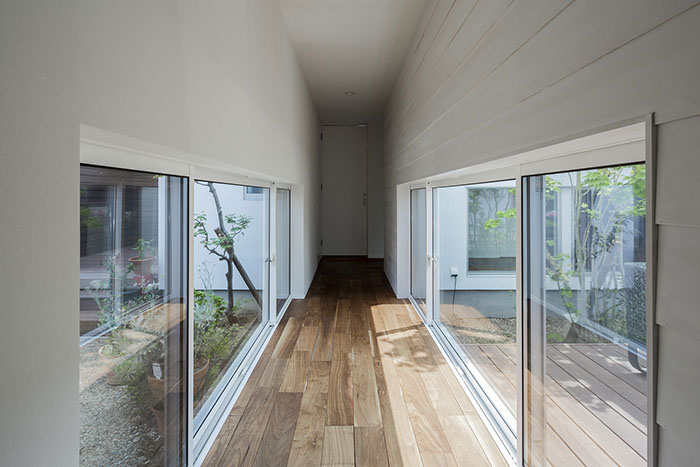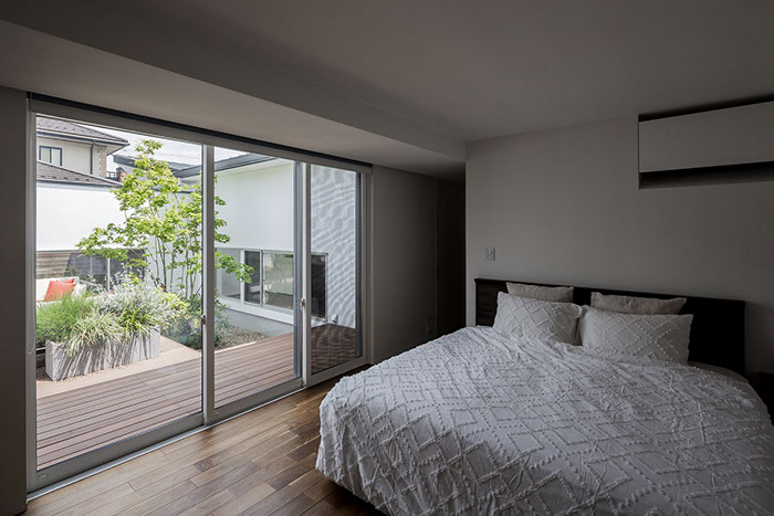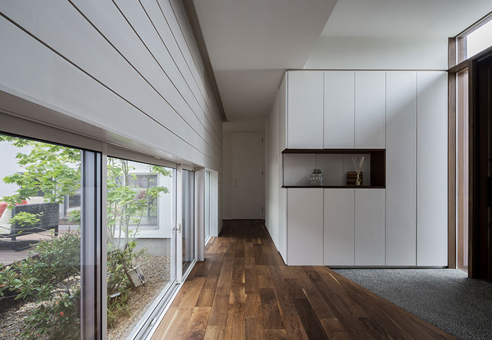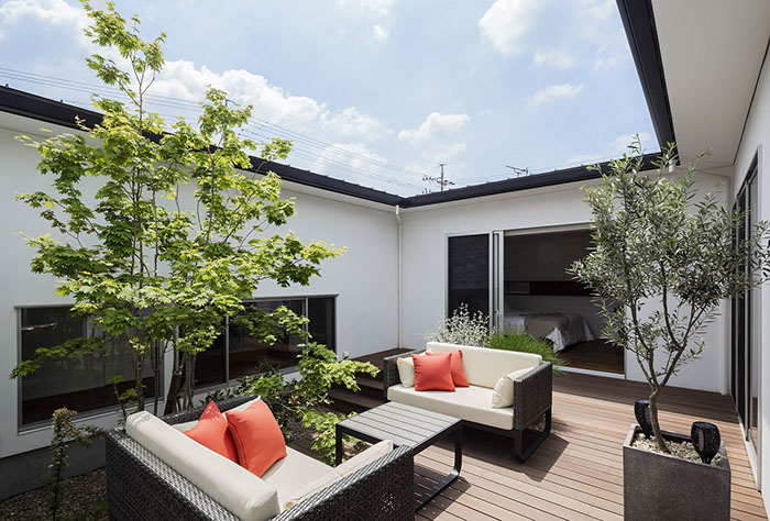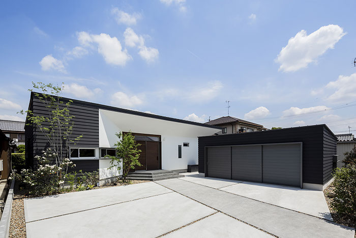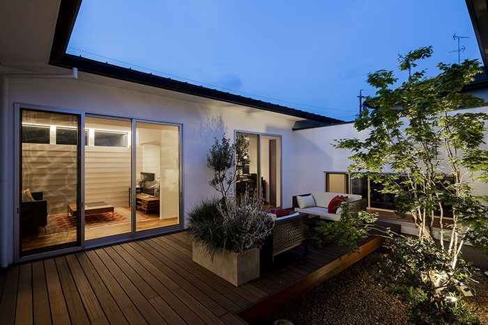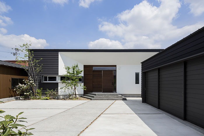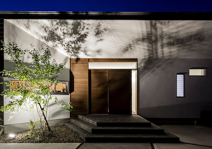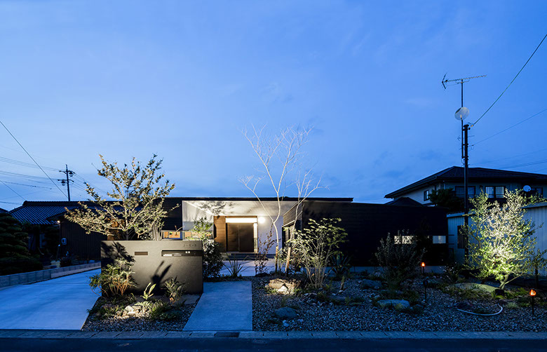 建築主は各部屋から緑が眺められ、安らぎと豊かさを感じながら過ごせるリゾート感のある平屋建ての住宅を望んでいた。コントラストが効いた印象的な外観と夜間でも植栽の影が外壁に映るように計画した植栽計画など、昼夜問わず印象的な住宅となっている。外部に面する部分は閉鎖的にしてプライバシーを確保しているが、ロの字型の中庭形式で計画することで、内部は外部との隔たりを感じさせない明るく開放感な空間になっている。中庭を囲んだ各部屋はどの場所からでも中庭へ行き来ができ、そして、どの場所からでも緑が眺められように視覚的にも繋げているため各所に広がりを感じさせている。