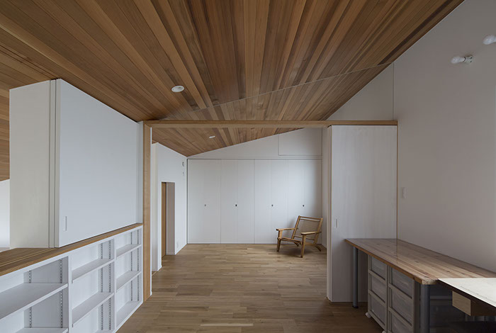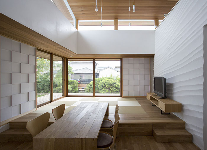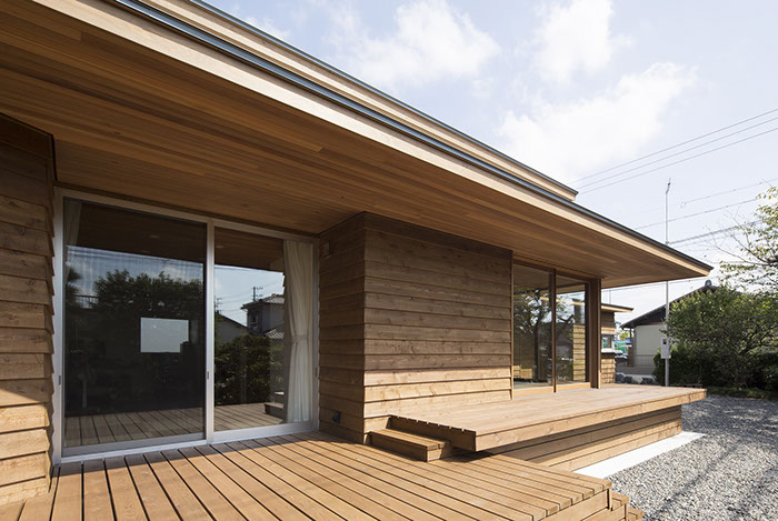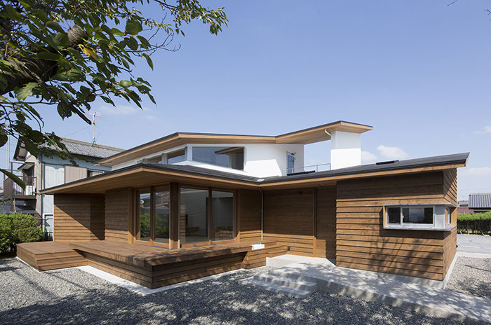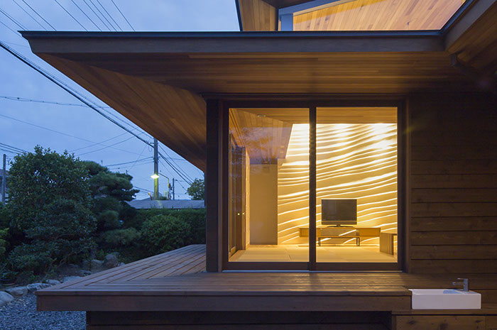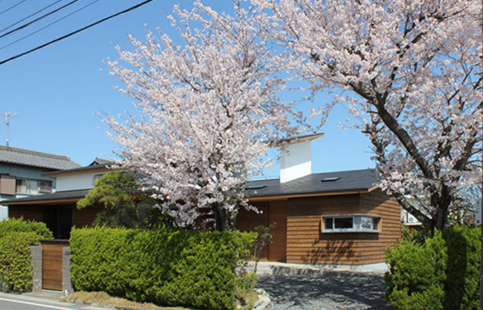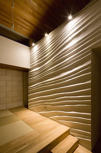建築主は温もりとやすらぎを感じながら生活できる住宅を望んでいた。2階建てだが、建物の高さを抑え、南側から見る外観は平屋建てのように見せている。内部は回遊性と開放感を意識して計画している。家事・生活導線だけでなく、外部テラスを含めて建物内外を回遊できることで、各スペースを最短距離で移動できる平面計画となっている。またリビングに吹抜けを設けることで開放感を与え、2Fの居室と吹抜けを繋ぐことで内部空間に一体感を与えている。内外の仕上材は左官材や木板を使用することで素材感による温もりを与えている。リビングの一部壁は、左官職人の久住有生氏による施工。波のうねりをイメージしたこの左官壁は、柔らかなうねりの模様が日常生活にやすらぎを感じさせる。