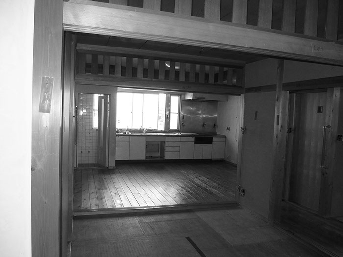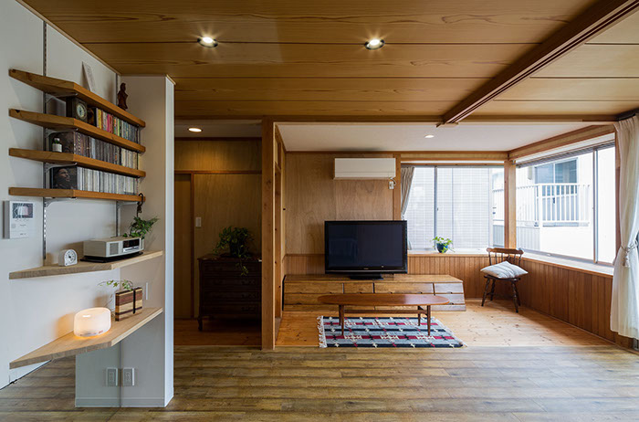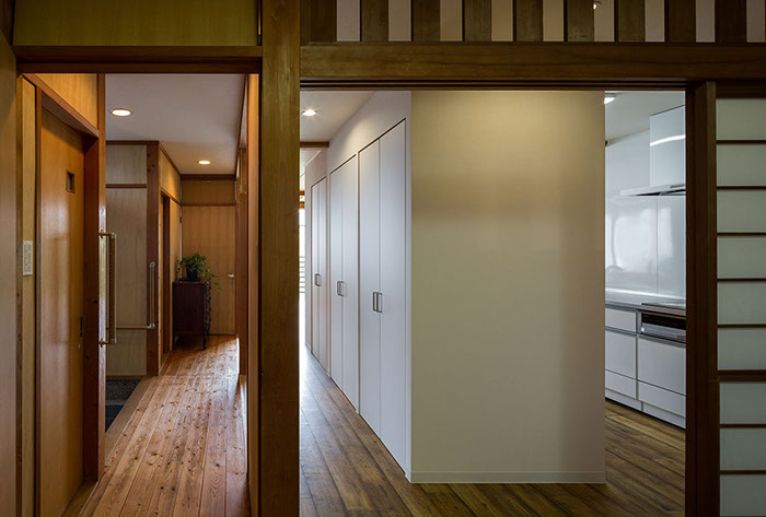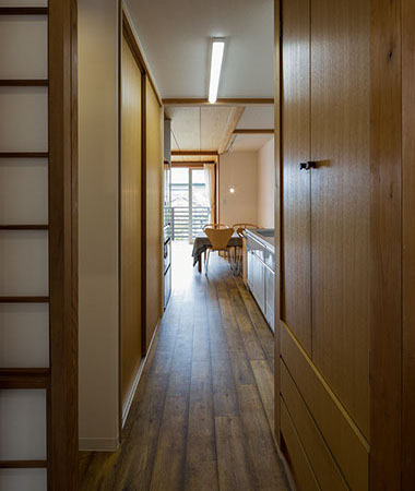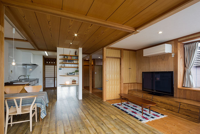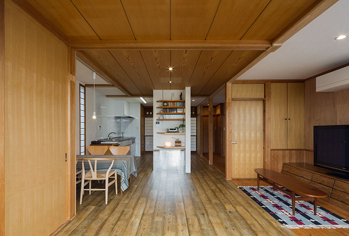 既存の建具や部材などをできる限り使いたいという考えから始まったリフォームの物件。元々は和室続きであった空間をLDKに変え、寝室と一続きのワンルーム的な使用ができる計画としている。また回遊性のある導線計画としている為、あらゆる場所から目的の場所まで最短距離で移動できる。既存建具や解体ででた部材(天井材、柱、枠材、長押等)は各所に加工転用し、惜しみなく使用している。全てを一新するのではなく、昔の記憶を継承しつつも開放感のある居心地よい新たな空間が出来上がった。